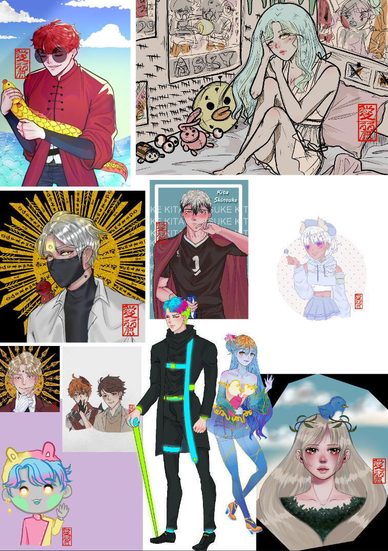 the progress of the art will be shown (sketch->outline->base color->final touch)
